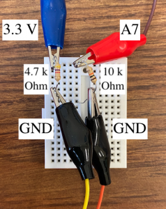 - Now use the Analog 7 sensor to record the voltage drop across the 10 k Ω resistor. See figure 6 and note the difference between Figures 5 and 6. The order of the resistors must be changed in order to read the correct voltage drop. Q2.5: What are the voltage drops across the 4.7 Ω and the 10 kΩ resistors?