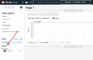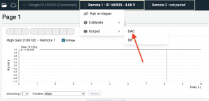 - We are going to apply voltage to the circuit at 0.5 V intervals between 0 V and 3.0 V. To do this, choose the High Gain Sensor in the IOLab software. Then click on “Remote 1” above the graph and choose “Output” from the dropdown menu. The click “DAC”. See Figure 2.