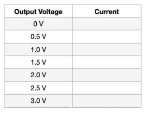 - Continue to increase the voltage at 0.5 V intervals up through 3.0 V and measure the current at each of these intervals. Record the current measurements in a table like the one below. Q1.2: Show your current measurements at 0.5 V increments.